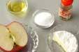耐熱容器にリンゴを並べ、グラニュー糖、シナモンを振り掛け、カマンベールをのせる。