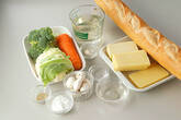フランスパンは2cm角に切り、表面を少し乾燥させておく。オーブンの余熱で乾燥させてもOKです。