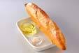 温めておいたオーブントースターでフランスパンを軽く焼き、ニンニクの切り口をパンにこすりつけて香りをつける。