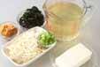 ○豆腐は水をきり、食べやすい大きさに切る。○モヤシはザク切りにして水に放ち、シャキッとすればザルに上げる。○塩ワカメは水洗いして塩を落とし、ザク切りにして水に放ち、塩分を抜き、水気を絞る。