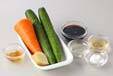 小鍋に<酢じょうゆ>の材料を入れて火にかける。煮立てば火を止め、ニンジン、ショウガ、ゴマ油を加え、人肌くらいまで冷めれば、キュウリを加える。