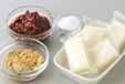 1個を半分に切り水でぬらしたお餅を、耐熱皿に重ならないように並べ、ラップをかけて電子レンジで45~60秒位加熱する。柔らかくなれば、お湯につけておく。