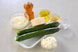 キュウリは縦縞に皮をむき、1cm幅の輪切りにする。