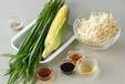 トウモロコシは外皮を取り、包丁で粒をそぎ落とし、ザルに入れ水洗いする。