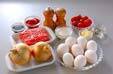フライパンにバター5gを熱し、1人分の卵液を流し入れて全体に広げ、半熟状になったら2の1/4量を中央に縦長にのせてフライパンを傾けて縁まで滑らせ、お皿に返しながらオムレツの形に整える。同様に4人分作る。