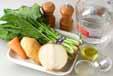 鍋にオリーブ油を中火で熱し、玉ネギが透き通るまで炒め、ニンジン、水気をきったジャガイモを炒め合わせる。
