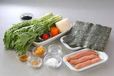 ワカメ、大根、ニンジン、水菜を器に盛り、鶏ささ身を散らせる。