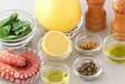 ゆでタコ足は斜め薄切りにして塩水で洗い、水気をきって<下味>の塩コショウをし、オリーブ油、レモン汁を全体にかける。