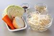 鍋にたっぷりのお湯を沸かし、モヤシ、キャベツ、玉ネギ、ニンジンを入れ、サッとゆでてザルに上げる。