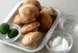 生シイタケは石づきを切り落とし、堅く絞ったぬれ布巾等で汚れを拭き取る。軸側から手で2つに裂き、風味づけに酒を振り掛ける。