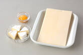 パイシートを並べ、卵を水少々でのばしたものを全体にぬり、カマンベールチーズをのせる。パイシートを2つ折りにかぶせて合わせ目をフォークで押さえてくっつける。