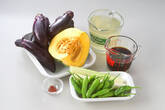 ナスを食べやすい大きさに切り、カボチャ、シシトウと共に器に盛りつけ、<合わせだし>を張り、白髪ネギをのせる。