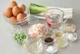 ボウルに1人分づつ、卵2個を割りほぐし、カニ身とその汁、白ネギを加え、さっと混ぜ合わせる。