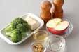 器に長芋、水切りしたリンゴ、冷ましたブロッコリーを盛り合わせ、<ドレッシング>を掛けていただく。