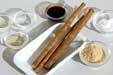 ゴボウはたわしで水洗いし、すりこぎで軽くたたき、4~5cmの長さに切り、太いものは2~4つに切る。