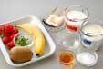 容器にラップをかけて冷蔵庫で90分以上冷やし固める。器に取り出し、好みの果物と盛り合わせ、あればミントの葉を飾る。