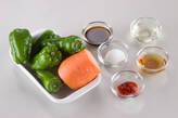 全体に油が回り、ピーマンが鮮やかな色になれば<調味料>を加え、水分がなくなるまで炒りつけ、器に盛る。