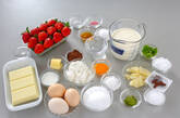 ボウルを氷水に当て、持ち上げて角の先が曲がる程度の固さに泡立て、氷水をはずす。別のボウルに1/3量を取り抹茶を混ぜ合わせ、<飾り用>のイチゴ5~6個を縦半分に切ってキッチンペーパーに切り口を下にしてのせる。