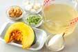 鍋にだし汁、カボチャ、玉ネギを入れて中火にかけ、煮立てば、カボチャが柔らかくなるまで5~6分煮る。
