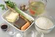 炊飯器に洗いもち米を入れ、<調味料>を加える。だし汁を炊き込みおこわの線まで入れ、ミツバ以外の具を加えてスイッチを入れる。