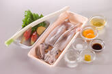 カは足を持って胴から引き抜く。胴はエンペラをはずし、1枚に開く。きれいに水洗いして皮をむき、縦半分に切る。足は目の下で切り落とし、くちばしを取る。足を切り揃えて皮をむく。