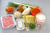 豚ロース肉、木綿豆腐、生シイタケ、エノキ、ニラ、白ネギ、モヤシ、玉ネギを加え、火の通った物から、煮汁と共にいただく。煮汁が少なくなったら、豆乳や水とキムチ鍋の素を加えて下さい。