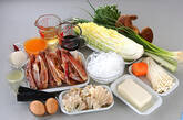 シイタケは石づきを切り落とし、固く絞った濡れ布巾で汚れを拭き、軸と笠に切り分ける。軸は縦半分に裂き、笠は飾り切りにする。ニンジンは薄く切り、型で抜く。
