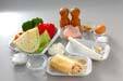 レンコンのはさみ揚げ、ピーマン、キャベツを盛り、トマトを添える。