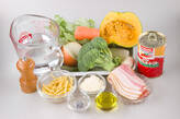 鍋にオリーブ油を中火で熱し、ベーコン、玉ネギ、ニンニクを炒め合わせる。全体にしんなりすれば、カボチャ、ニンジン、セロリ、ブロッコリーを炒めあわせる。