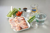 煮汁が少なくなってくれば、手羽元を寄せてアスパラを煮汁にからめる。