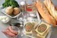 フォンデュ用の長いフォークに好みの野菜やパン、ソーセージ、ゆでウズラ卵、エビを突き刺し、チーズにからめていただく。