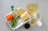 高野豆腐はぬるま湯に浸してよくもどし、手ではさんで水気を軽く切り、1枚を4等分に切る。