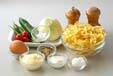 鍋に塩、水、卵を入れ中火にかける。煮たったら火を少し弱め、8~10分ゆでる。卵は水に取り、冷めれば殻をむき、フォーク等で粗くつぶしておく。