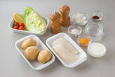 ジャガイモを揚げている間に、白身魚を一口大のそぎ切りにし、塩コショウを振り掛ける。<衣>はよく混ぜ合わせておく。レタス、プチトマトは水洗いし、レモンは半分に切る。