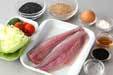 サバは小骨を骨抜きで引き抜き、ひとくち大の削ぎ切りにし、<下味>をからめて10分おく。