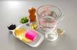鍋に<スープ>を入れて強火にかけ、固形チキンスープの素が煮溶けたら、カマボコ、油揚げを加える。