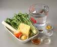 塩、粗挽き黒コショウで味を整え、ニンジン、水菜を加えてしんなりすれば油揚げ、ゴマ油を加え、器によそう。