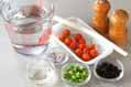 白ネギは4cmの長さに切り、縦に切り込みを入れて1枚に開き、縦にせん切りにする。干しワカメは水で柔らかく戻し、水気を絞る。プチトマトはヘタを取り、サッと水洗いする。
