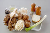 アルミホイルにマイタケ、ホワイトシメジ、生シイタケ、エリンギ、エノキ、白ネギ、玉ネギの1/4量をのせる。