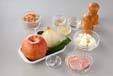 食べる直前に<ドレッシング>を入れたボウルにリンゴ、キュウリ、玉ネギ、ハム、カッテージチーズを混ぜ合わせる。