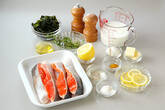 サーモン(生鮭)の両面に塩コショウをふり、薄く薄力粉をまぶす。