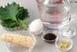 鍋に<スープ>の材料を入れ、中火にかけ、チキンブイヨンが溶ければ、塩、薄口しょうゆで少し濃いめに味を整える。