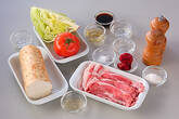 <調味料>を加えて煮からめ、レタスを敷いた皿にのせ、トマトを添える。