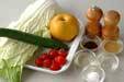 梨、白菜、キュウリ、プチトマトをサッと混ぜ合わせて器に盛り、よく混ぜ合わせた<ゴマドレッシング>を掛ける。