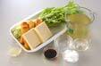 高野豆腐はタップリのぬるま湯又は水に10分位つけ、さわってみて芯まで柔らかくなっていたら両手ではさんで押さえるように水気を絞り、1枚を6~8つに切る。