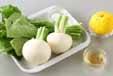 カブ、カブの葉を合わせ塩で軽くもみ、しんなりすれば水気を絞る。