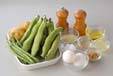 ソラ豆、サヤインゲンは粗熱が取れれば水気を切り、ソラ豆は薄皮をむき、サヤインゲンは2~3cmの長さに切る。ゆで卵は殻をむき、黄身と白身に分けフォークで粗くつぶす。
