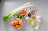 ボウルに1人分ずつ、卵2個を割りほぐし、カニ風味カマボコ、粗いみじん切りの白ネギを加えてサッと混ぜ合わせる。