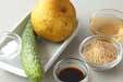 <ゴマ酢>の材料を混ぜ合わせ、キュウリ、梨を加えて和え、器に盛る。