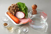 鍋に<ゆでスープ>を強火にかけ、固形ブイヨンが煮溶ければ、シメジを加えてサッとゆで、取り出す。